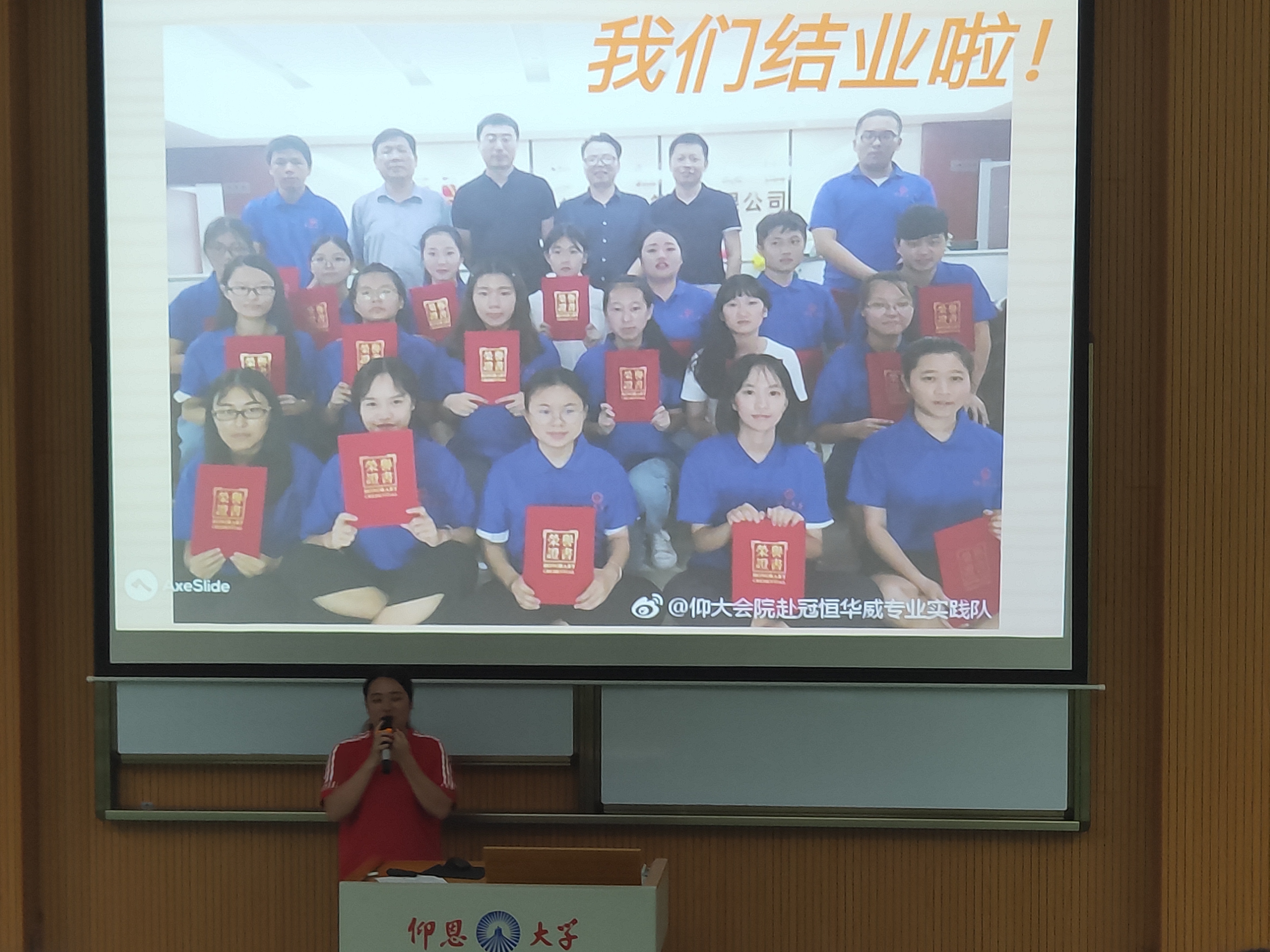 紧接着,各实践队代表通过精心制作的PPT、视频依次从团队组建、活动主题、组织形式、体会感想等内容进行实践成果汇报和分享。评委们根据每支实践队的分享表现和内容评选出了暑期实践表现优秀的实践队并对其进行表彰。