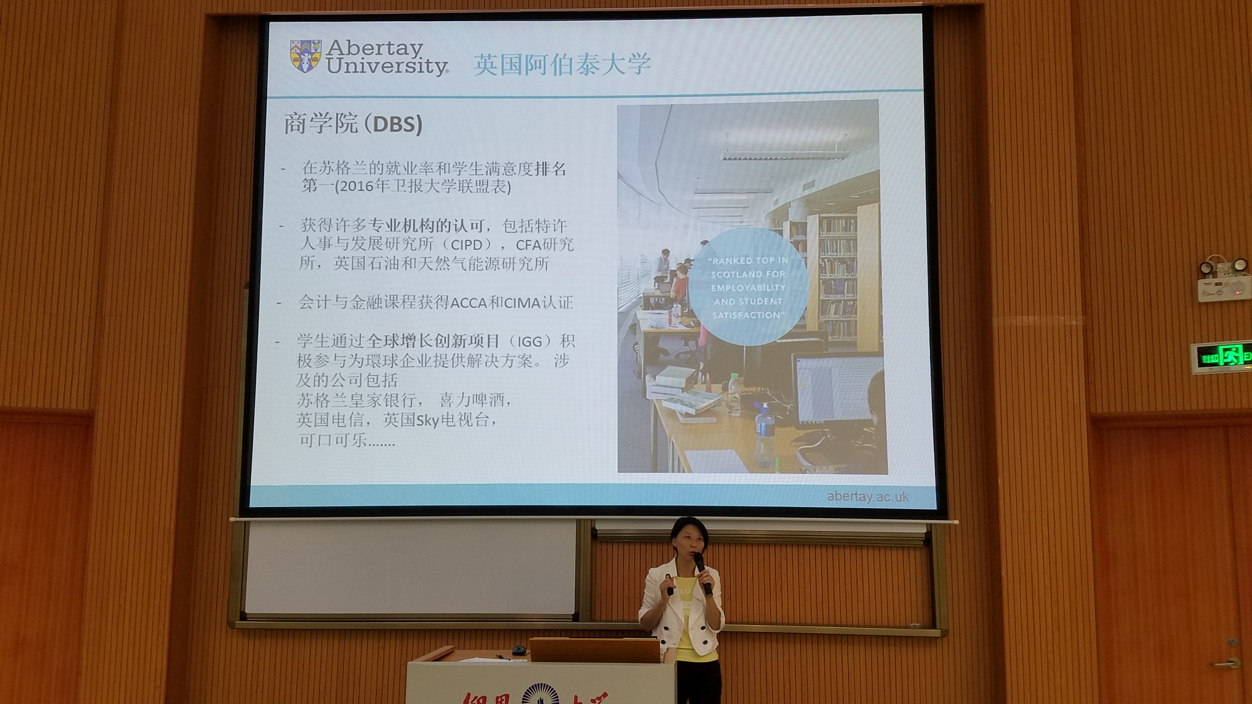 10月25日下午4点,kaiyun开云官方kaiyun开云官方与阿伯泰•邓迪商学院赴英访学项目对接宣讲会在和昌教学楼致知讲堂举行,此次活动是kaiyun开云官方在教学与人才培养之路上积极探寻国际交流与合作的重要举措。出席本次宣讲会的有阿伯泰•邓迪商学院中国地区负责人王燕平、国际合作与交流处副处长韩勇、国际合作与交流处老师洪燕妮、kaiyun开云官方院长何杨英、党总支书记兼副院长高雪琪、副院长任敏、kaiyun开云官方全体教师、kaiyun开云官方2018级全体新生以及其他年级对该项目有兴趣的学生。
