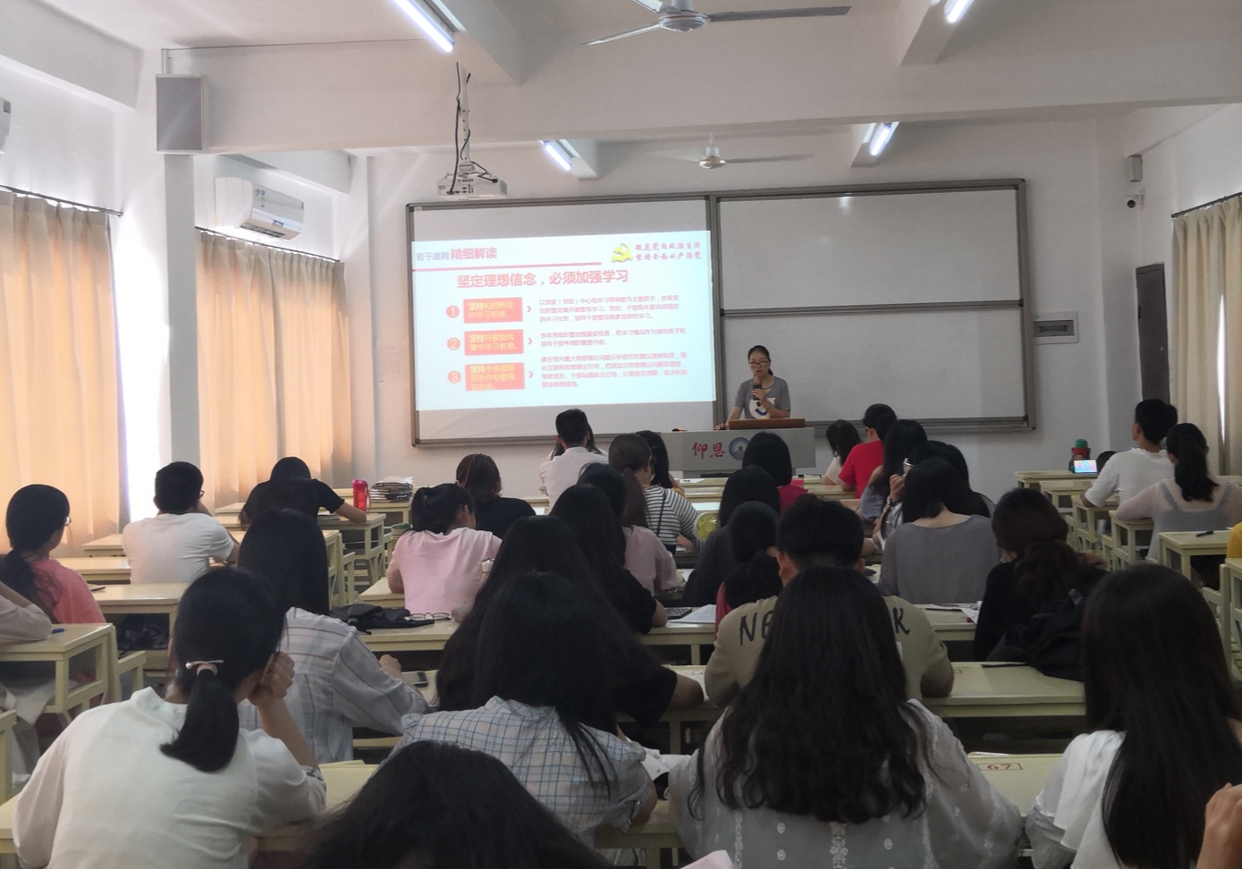 高雪琪老师指出严肃党内政治生活是全面从严治党重要基础,党要管党必须从党内政治生活管起,从严治党必须从党内政治生活严起。接着其从以下六个方面详细讲解了《关于新形势下党内政治生活的若干准则》:一是准则的制定背景,最新准则是在2016年10月27日中国共产党第十八届中央委员会第六次全体会议通过的,这是完善“四个全面”战略布局的需要,是深化全面从严治党的需要,是解决党内存在突出矛盾和问题的需要;二是重点和关键,新形势下加强和规范党内政治生活,重点是各级领导机关和领导干部,关键是高级干部特别是中央委员会、中央政治局、中央政治局常务委员会的组成人员;三是党内政治生活中出现的一些突出问题,在一些党员、干部包括高级干部中,存在着理想信念不坚定、对党不忠诚、纪律松弛、慵懒无为,拜金主义不同程度存在,拉票贿选现象屡禁不止,违法乱纪,谋取权位等现象滋生蔓延;四是关于新形势下党内政治的若干准则,应要做到坚定理想信念、坚持党的基本路线、坚决维护党中央权威等各项准则;五是五大特点读懂《准则》,包括以党章为根本依据、坚持问题导向、体现约束与激励相结合;六是结合新《党章》学习《准则》。针对以上这些内容,通过高雪琪老师的详细解读,大家对新形势下党内政治生活的若干准则有了更加全面和更加深刻的理解和把握。