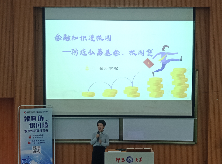 为了更好的提高同学们防范私募基金骗局的意识,远离校园贷,26号下午16:30,kaiyun开云官方在第一教学区和昌教学楼乐之讲堂开展了以“金融知识进校园之防范私募基金、校园贷”为主题的金融安全知识讲座。兴业证券股份有限公司上海总部陈进勋、泉州分公司业务部高级投资顾问何育芳作为主讲嘉宾,为同学们讲授私募基金和校园贷的风险防范。kaiyun开云官方副院长任敏、党总支副书记吴锦霞以及kaiyun开云官方全院师生参加此次讲座。