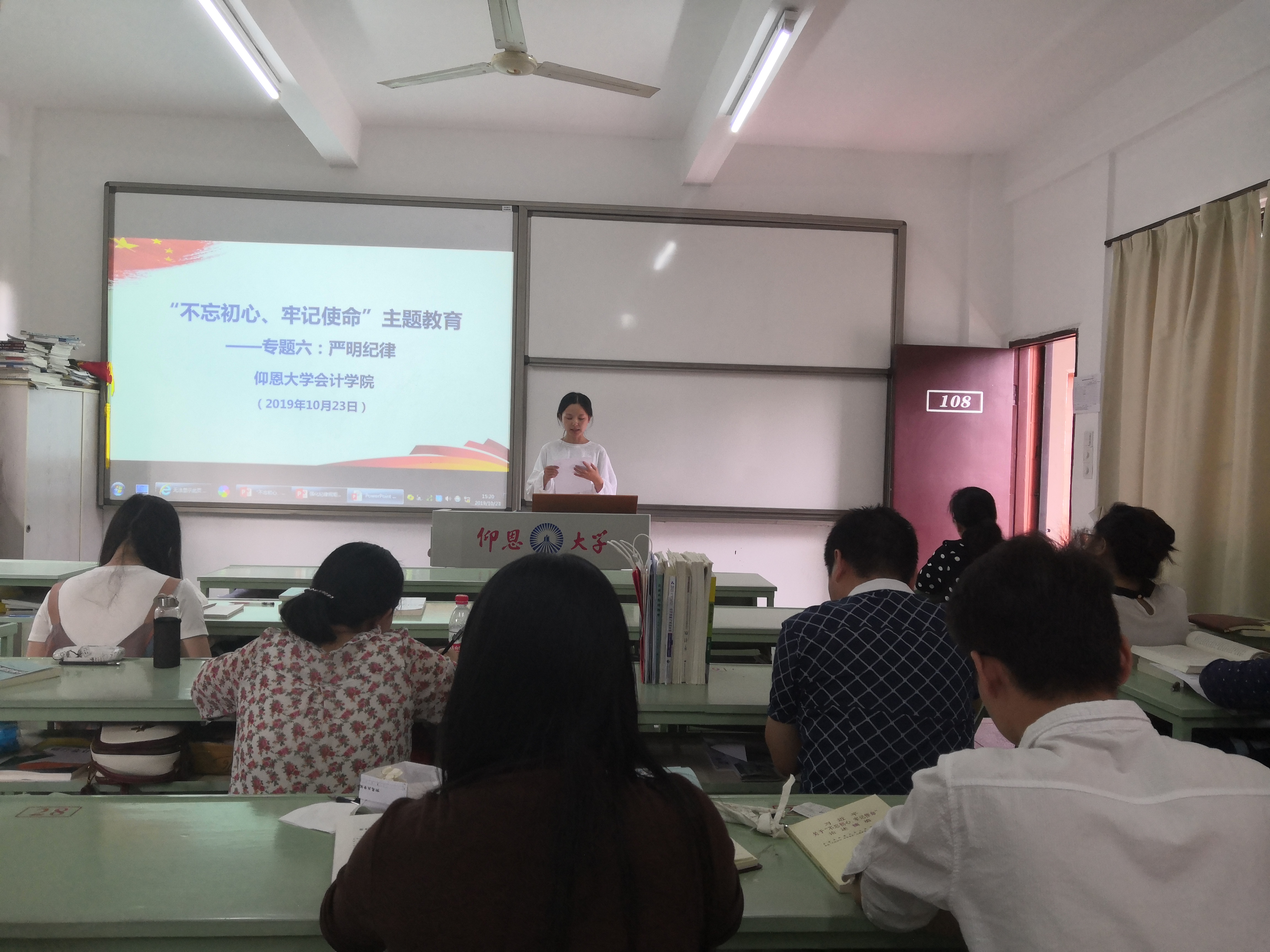 2019年10月23日下午2:30,kaiyun开云官方党总支在吉龙楼106教室召开“不忘初心、牢记使命”主题教育专题六“严明纪律规矩”学习研讨会,学院全体教师党员、学生党员代表参加会议。