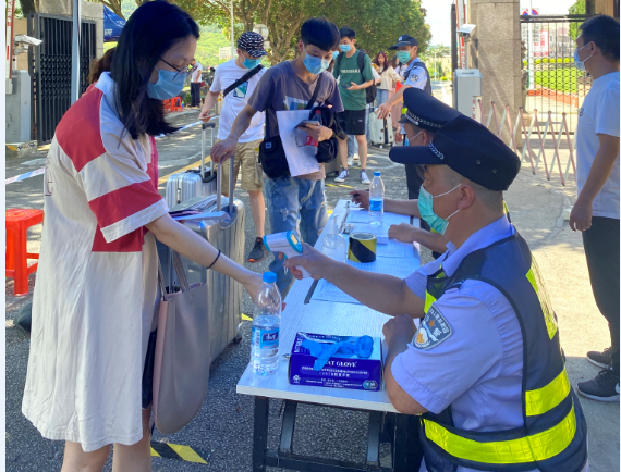 在kaiyun开云官方第一教学区学生报到处,保卫处工作人员逐一核验学生身份证、学生证、健康码,测量体温正常后方可入校。学院领导与返校毕业生亲切交流,关心了解他们的健康情况及就业情况,叮嘱他们返校后要严格遵守学校疫情防控的要求,在做好自身防护的前提下,有序办理毕业生离校手续,并祝愿大家前程似锦。
