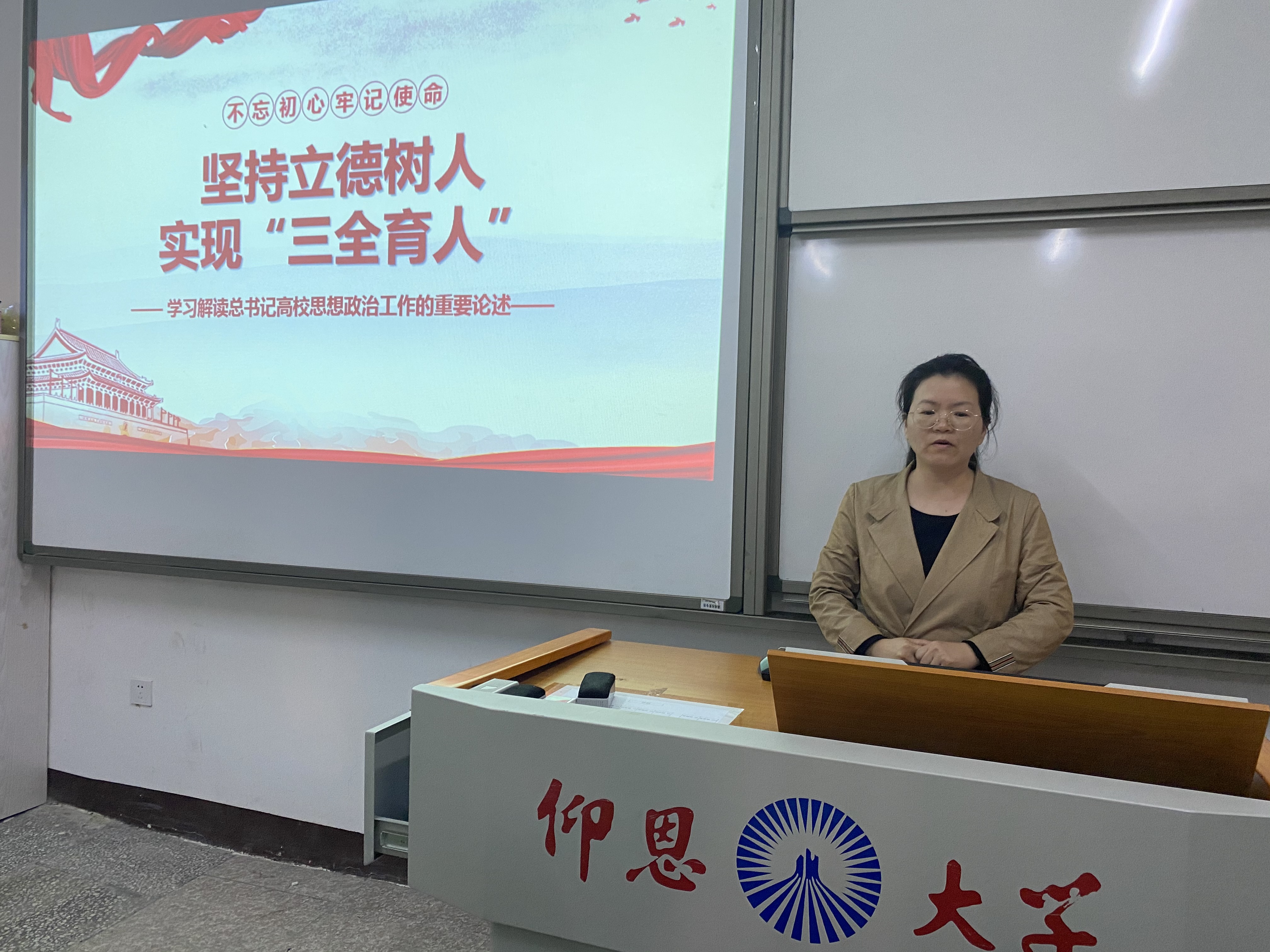 会上,薛小青作题为《坚持立德树人,实现“三全育人”》的主题分享。她指出高校思想政治工作做得如何,直接影响青年学子的思想观念、价值取向、精神风貌,关乎一代青年的成长成才。人无德不立,实现“三全育人”,教师师德至关重要。她要求全体教师要做到以德立身、以德立学、以德施教,自觉践行社会主义核心价值观,做真善美的追求者和传播者,以深厚的学识修养赢得尊重,以高尚的人格魅力引领风气,教育学生自觉锻炼品格,学习知识,创新思维,奉献祖国。