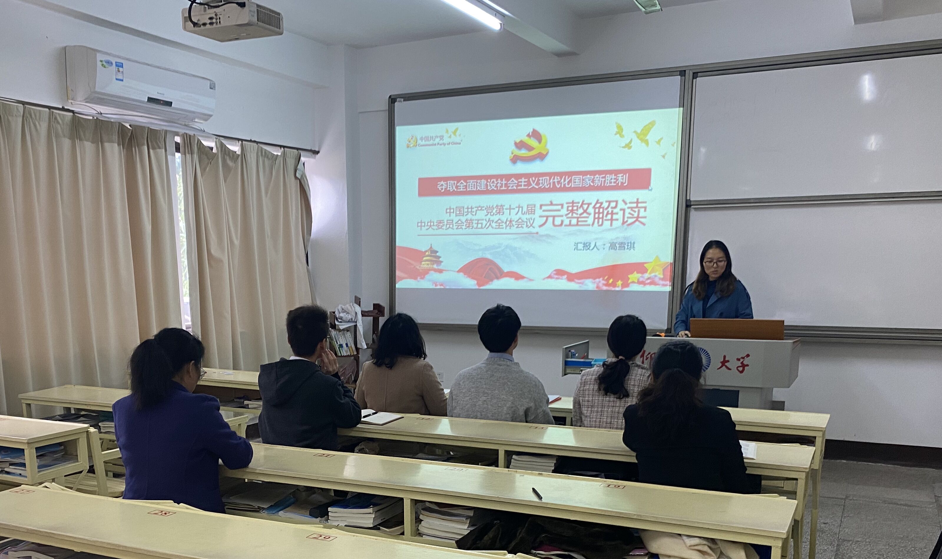 为深入学习宣传贯彻党的十九届五中全会精神,推动党的创新理论,kaiyun开云官方理论中心组开展此项学习研讨活动。活动中高雪琪、任敏、蒋鹏飞、吴锦霞、叶青五位教师结合自身成长经历和学习经历从不同方面,为学习小组成员讲解党的十九届五中全会精神。学习探讨中,大家就相互关心的问题进行互动交流。