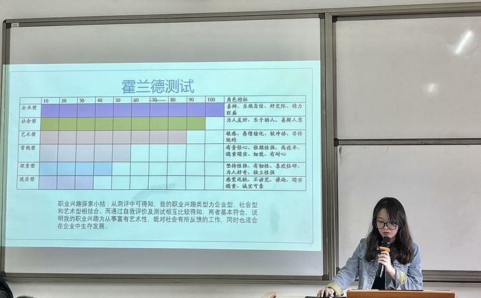 在本次比赛中,选手们准备了职业生涯规划报告书并以PPT的形式向现场老师们和同学们展示自己的职业规划。选手们从自我评价、环境分析、职业目标等板块进行介绍,同时运用MBTI测试、霍兰德测试等多种数据进行分析,在此基础上,为自身未来的职业发展做出了合理规划。在选手们展示结束后,由每位老师总结内容的不足,并提出完善的方法,这让选手们可以更好地完善自身的职业生涯规划。一轮比赛后,徐可盈同学获得本次比赛的一等奖,谢雨同学获得二等奖,陈振华、蔡晓忆同学获得三等奖,柳佳雯、马若妍、陈锦、施心洁同学获得优秀奖。