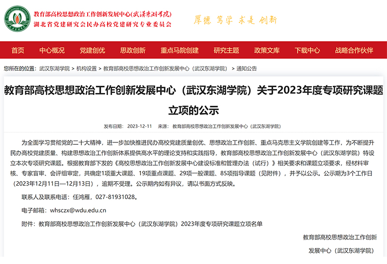 近日,教育部高校思想政治工作创新发展中心(武汉东湖学院)公布了2023年度专项课题立项名单。根据教育部下发的《高校思想政治工作创新发展中心建设标准和管理办法(试行)》相关要求和课题立项要求,经材料审核、专家盲审...