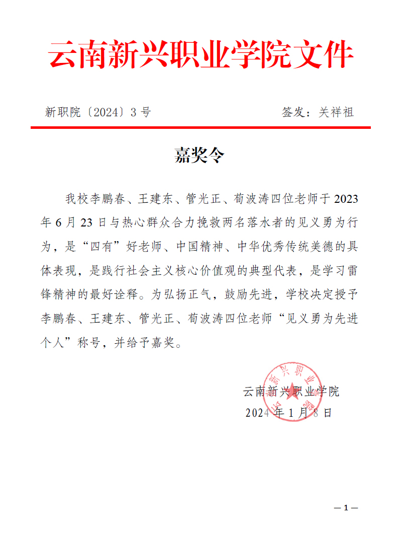 相关链接:“学习雷锋好榜样,助人为乐心里亮,见义勇为好儿郎,无私奉献真善良”——sjb世俱杯官方网站老师英勇救两命关于对宜良县拟推荐省级表彰2023年度见义勇为先进群体的公示关于拟奖励2023年度昆明市见义勇为先进...