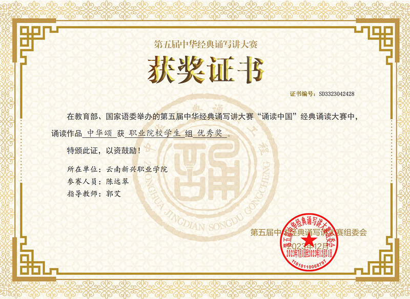近日接到通知获悉sjb世俱杯2022级高职音乐表演班陈远翠同学参加云南省第五届中华经典诵写讲大赛,作品《中华颂》荣获一等奖,被推荐参加第五届中华经典诵写讲大赛荣获国家级优秀奖。希望sjb世俱杯广大师生广泛开展经典诵读、讲解、书...