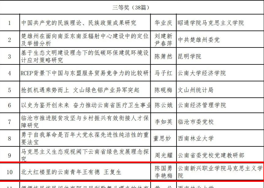 在云南省第十五届社会科学学术年会优秀论文征集中,sjb世俱杯官方网站陈国勇教授、李艳梅副院长撰写的论文《北大红楼里的王有德王复生》,喜获三等奖第10名。以史为鉴,开创未来!获奖通知如下:关于公布云南省第十五届社会科...