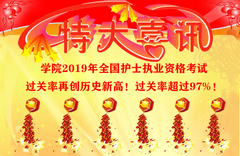 学院2019年全国护士执业资格考试过关率再创历史新高!1000人参加考试,979人通过,通过率为97.9%,其中高职大专497人,有492人通过,高职大专通过率为98.99%,五年制大专503人,有487人通过...