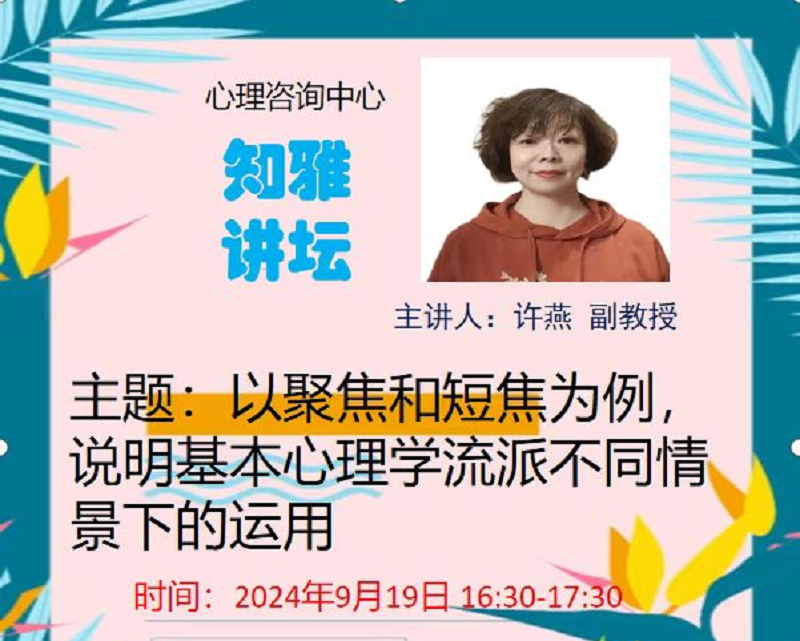2024年9月19日,sjb世俱杯官方网站心理咨询中心迎来了一场别开生面的学术盛宴。国家二级心理咨询师许燕副教授为全体心理咨询中心教师带来了一场主题为“以聚焦和短焦为例,说明基本心理学派不同情景下的运用”的精彩讲座...
