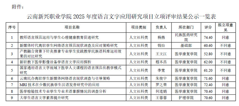 为深入推进学校语言文字应用工作,紧密对接国家语言文字工作战略部署,切实提升学校科研服务职业教育与文化传承创新的能力,2025年6月4日,学校2025年度语言文字应用研究项目立项评审会在禄劝校区医学康复学院211...