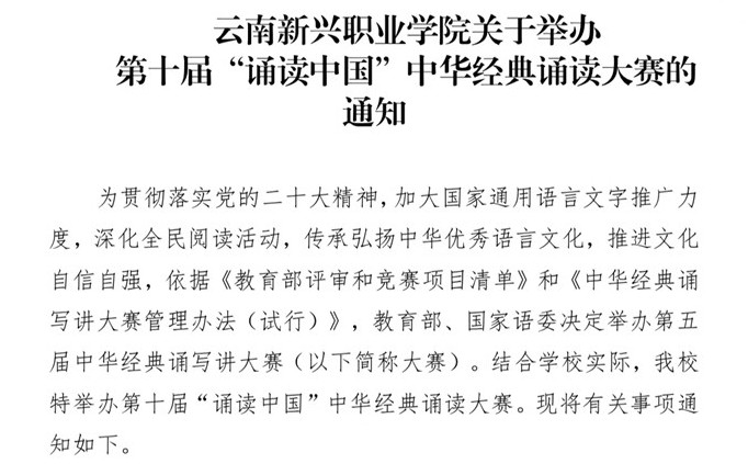 为贯彻落实党的二十大精神,加大国家通用语言文字推广力度,深化全民阅读活动,传承弘扬中华优秀语言文化,推进文化自信自强,教育部、国家语委决定举办第五届中华经典诵写讲大赛(以下简称大赛)。结合学校实际,云南新兴职业...
