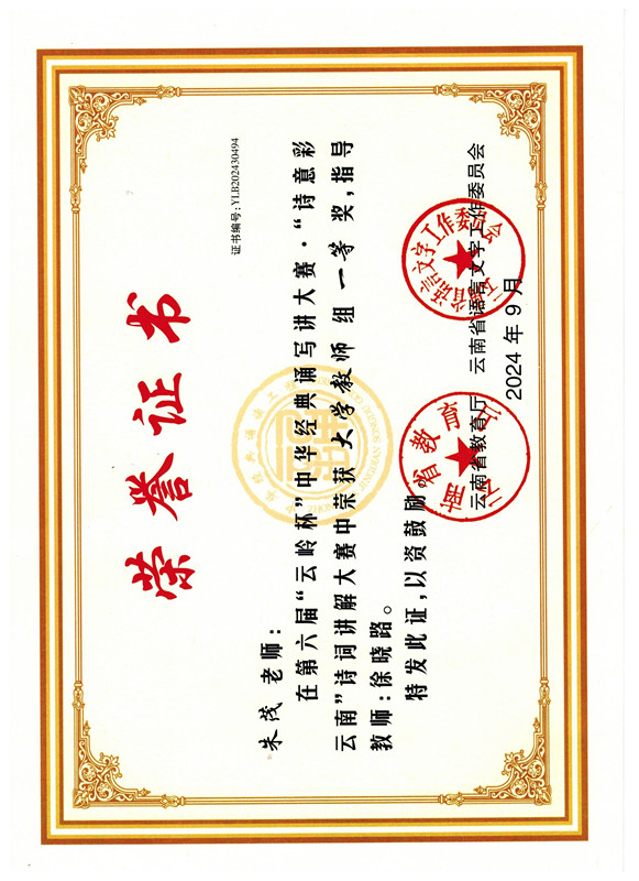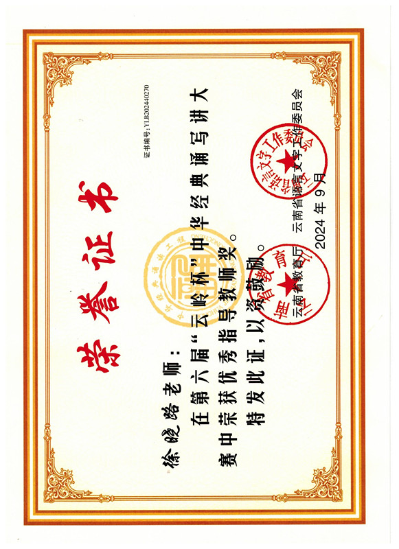 2024年5月sjb世俱杯官方网站心理咨询中心按照云南省语言文字工作委员会、云南省教育厅《关于举办云南省第六届“云岭杯”中华经典诵写讲大赛的通知》要求,组织中华经典诵写讲大赛校赛,并将表现突出的4名校赛优秀选手推荐参加三个赛项四个组别的省赛。近日,收到云南省语言文字工作委员会 云南省教育厅关于公布第六届“云岭杯”中华经典诵写讲大赛比赛结果的通知,学校推荐作品全部获奖,共获奖6项,分别为:一等奖1项、二等奖3项、三等奖1项、优秀指导教师奖1项。获奖情况如下: