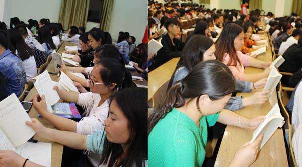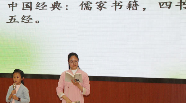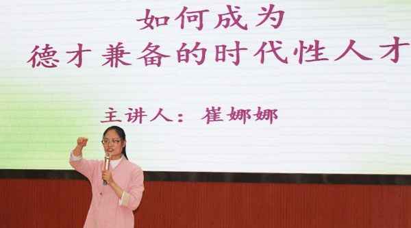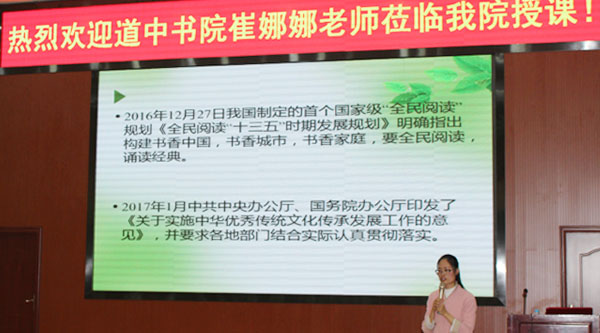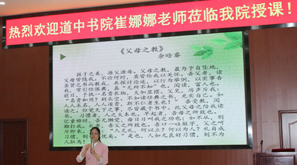 崔娜娜老师首先说明了德才兼备的重要性,同时告诉处在这样一个高速发展社会中的学子们应该把自己当作祖国未来的希望来培养自己,要勇于担起身上的责任,努力实践“今天我以学校为荣,明天学校以我为荣”的箴言。古人云:“腹有诗书气自华”,只要饱读诗书,学有所成,气质才华自然横溢。中国的经典是不受时间和空间限制的,历经了中华上下五千年的考验而名冠世界,我们应该珍惜老祖宗的留下的精华,多读经典,为以后做铺垫。崔娜娜老师表示,生命是一长串的积累,看似简单的读书,其实对各学科都有帮助,要像竹子一样有扎根精神。同时讲解了诵读经典的方法:以读为主,听为辅,以不讲解为妙。