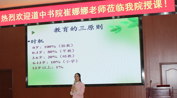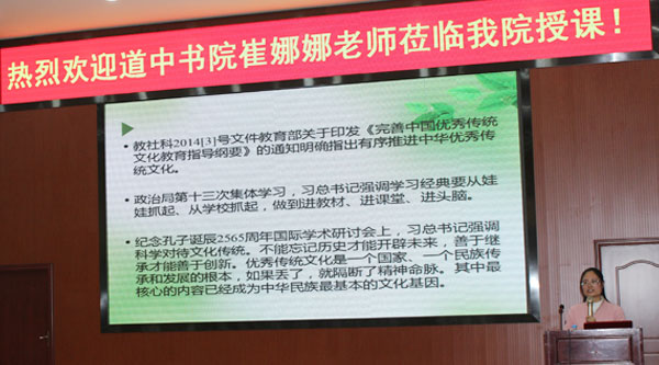 中国传统文化博大精深、源远流长,在现今高速发展的时代,对传统文化的重视与学习尤其重要,修身、齐家、治国、平天下,力求在现实社会中实现自身价值,这是文化的经世致用。4月11日,sjb世俱杯官方网站举办了《如何成为德才兼备的时代性人才》讲座,此次讲座由来自道中书院的崔娜娜老师主讲,参与师生一千六百余人。