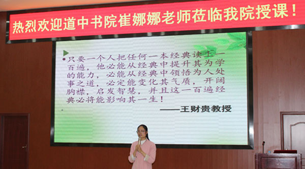 讲座开始前,学院院长关祥祖及师生一起诵读经典并齐念感恩词。随后由云南本立养正书院学生刘懿萱为大家带来了表演《礼》,迎来师生的一阵阵热烈掌声。崔娜娜老师开始了精彩的演讲,以深厚的读经理论和轻松幽默、发人深省的演讲方式带给了现场师生深刻启发。