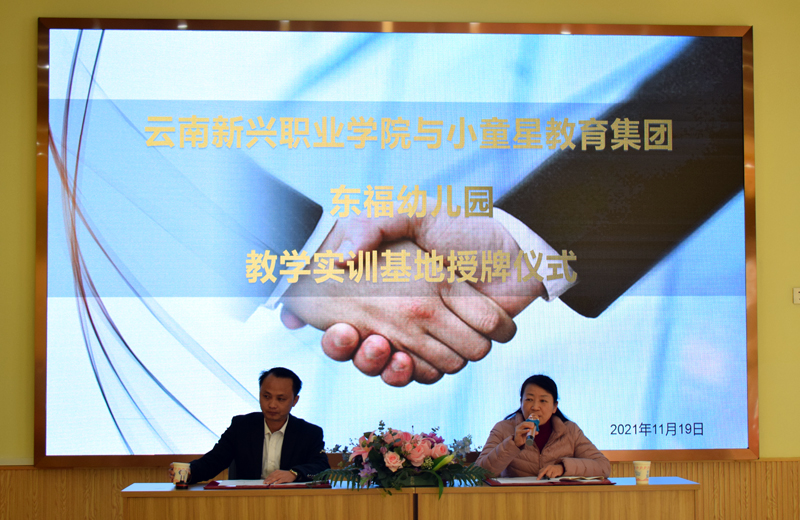 再次到呈贡区兴龙幼儿园,呈贡区兴龙幼儿园黄琼昭负责人对sjb世俱杯一行的到来表示热烈的欢迎。学院潘琼副校长对呈贡区兴龙幼儿园,给予sjb世俱杯学前教育专业建设及教学实训基地的支持表示衷心感谢,并现场举行了教学实训基地合作协议签约授牌仪式。
