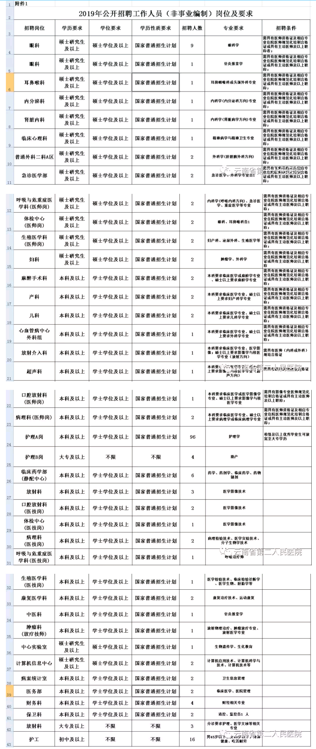 详见云南省第二人民医院2019年公开招聘编制外工作人员岗位及条件(附件1)。